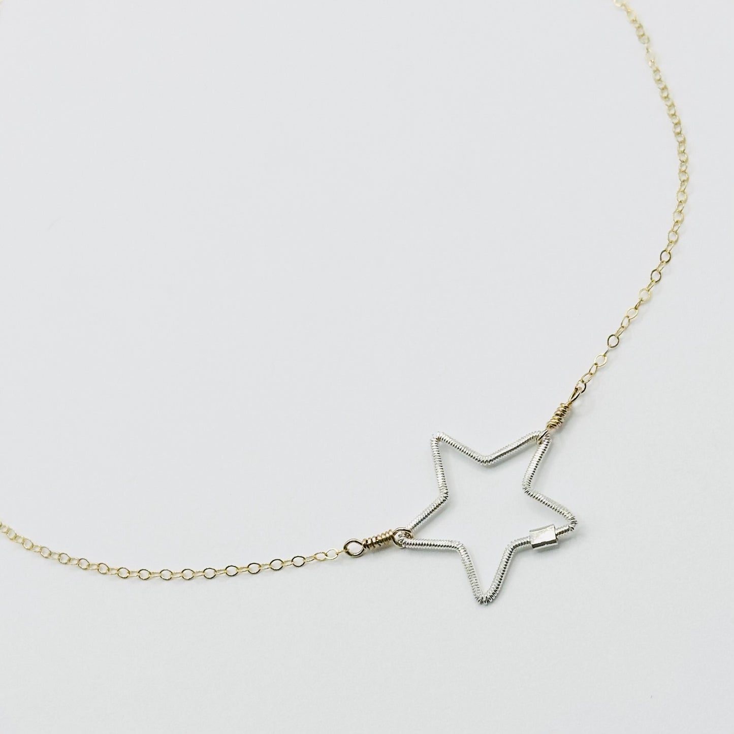 Guitar string star on sterling silver or 14k gold-filled 17-18" chain. All necklaces have 1" extender with the exception of the gold-filled chain.