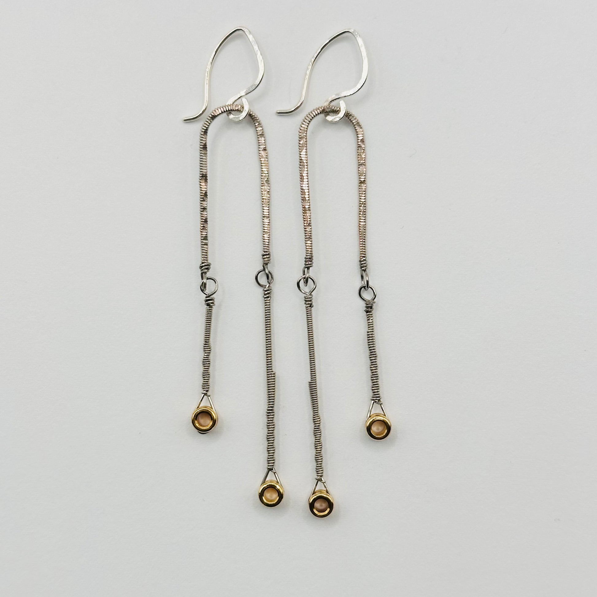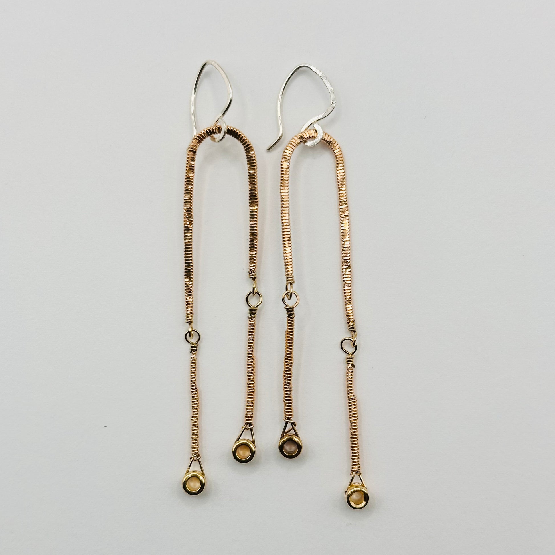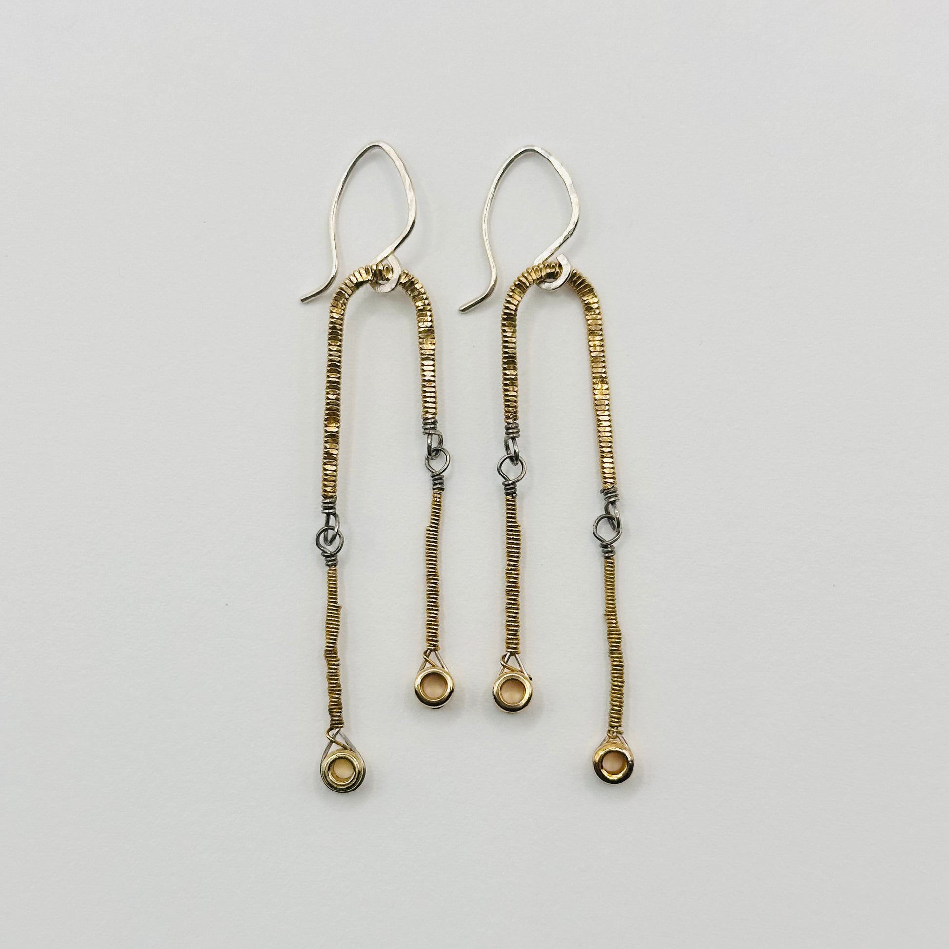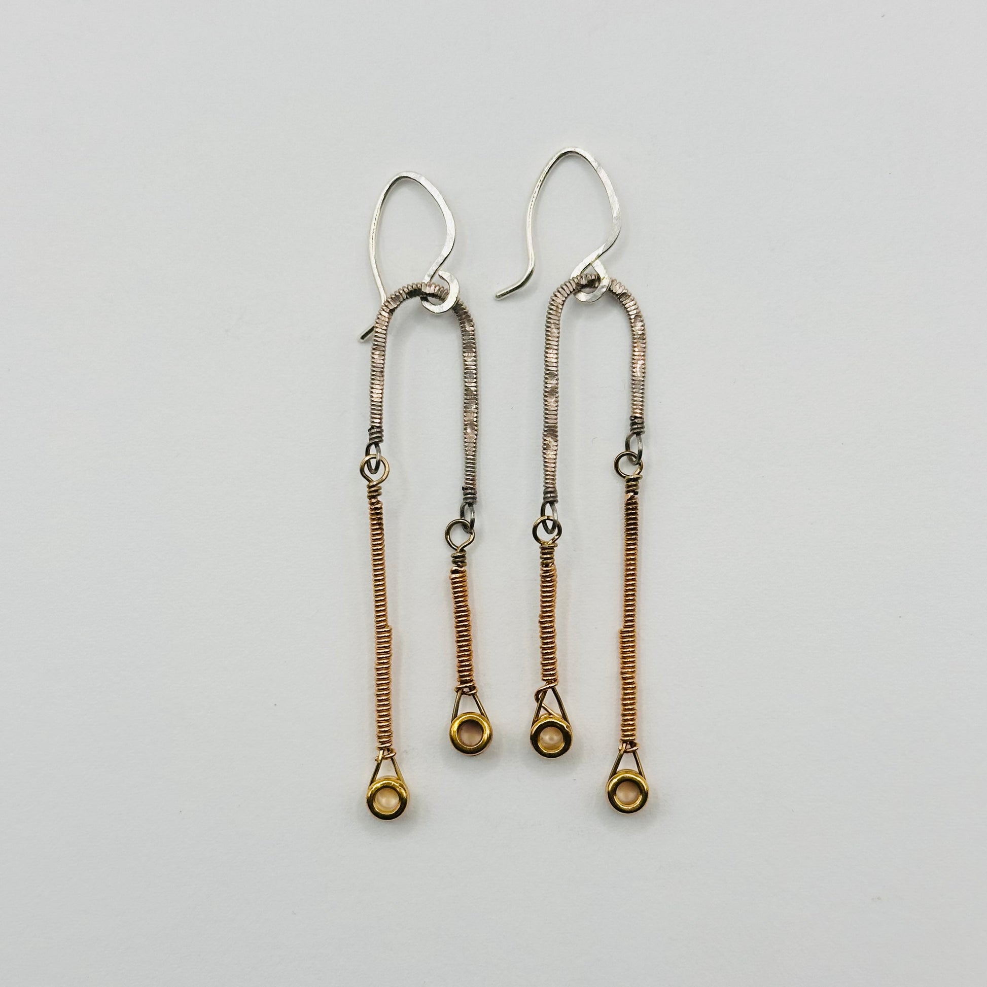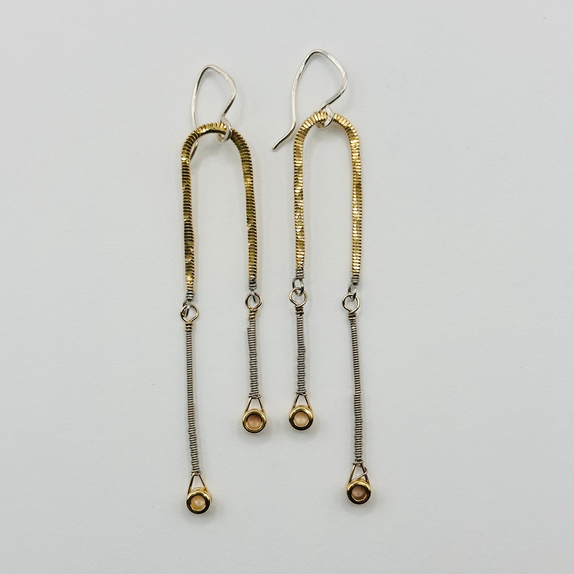 Hammered arch with two connected string ends on hand formed sterling silver ear wires.