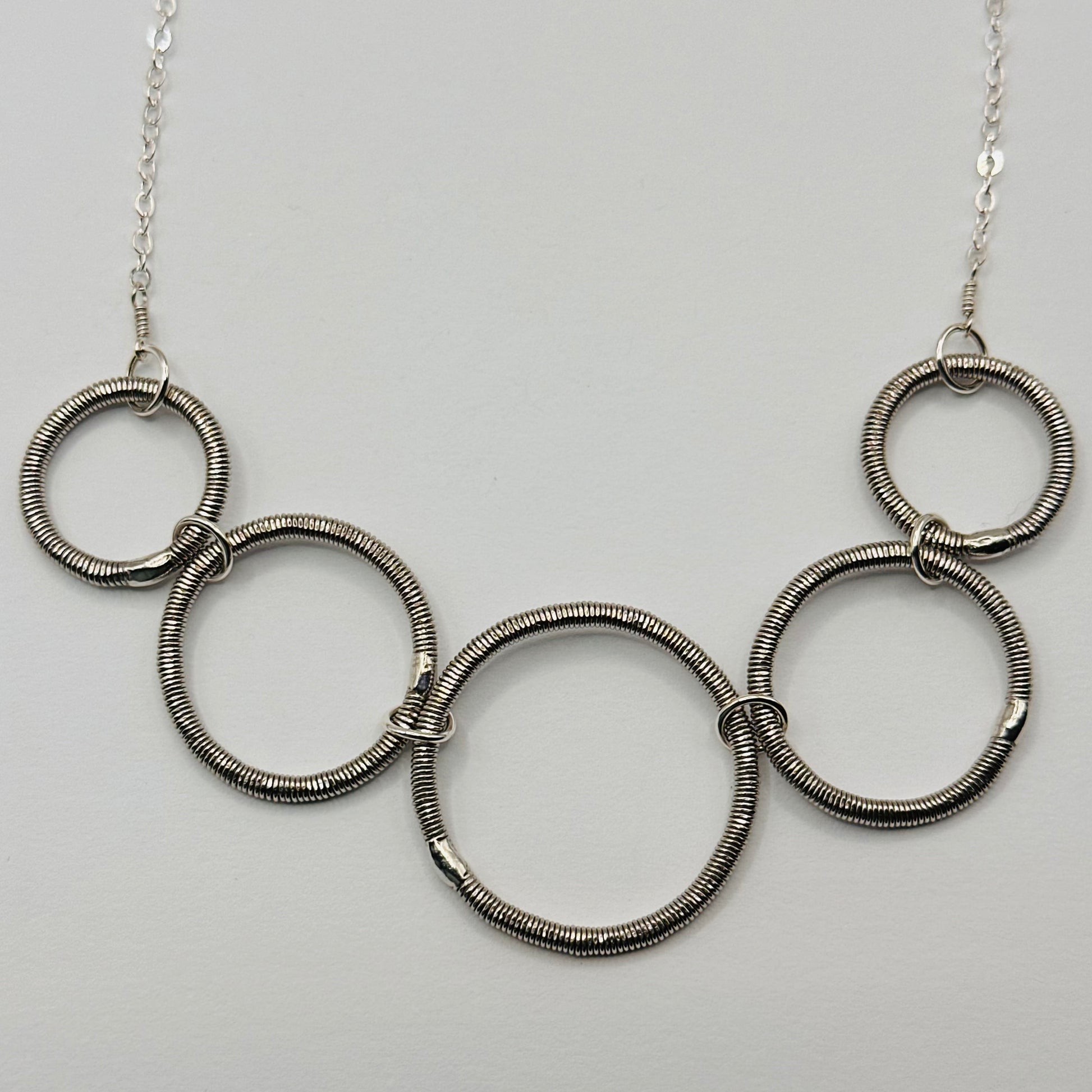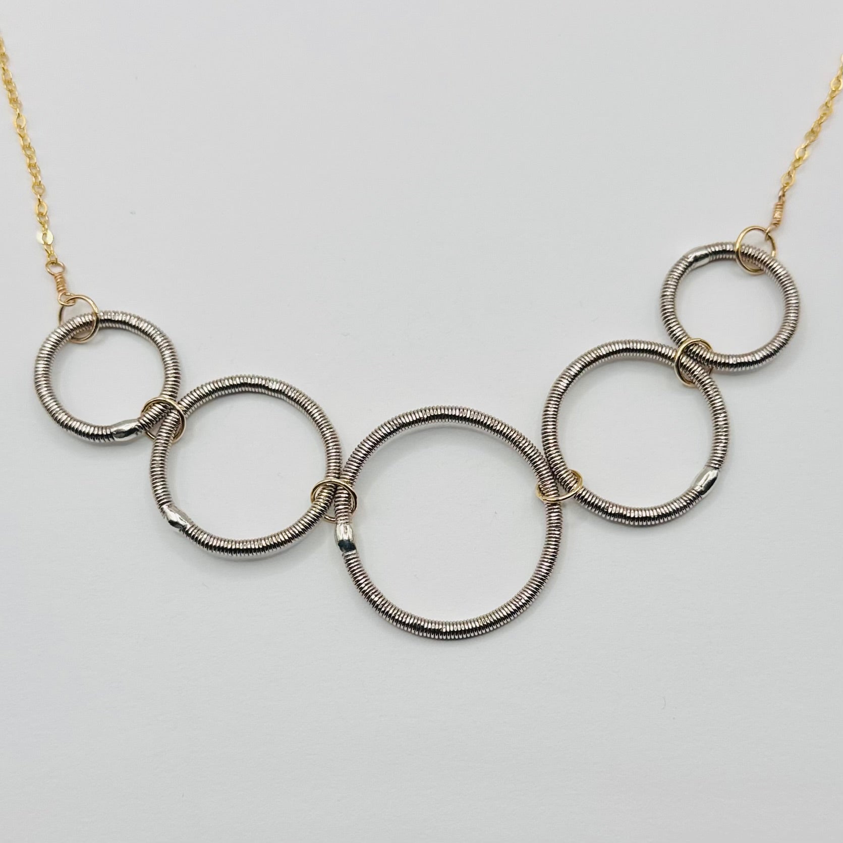 Five bass string circles on either sterling silver or 14k gold-filled chain. Each measuring approximately 19" with a 1" extender.