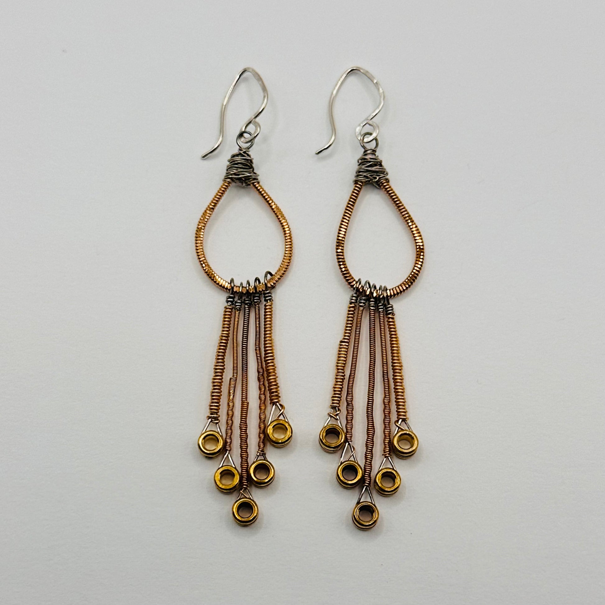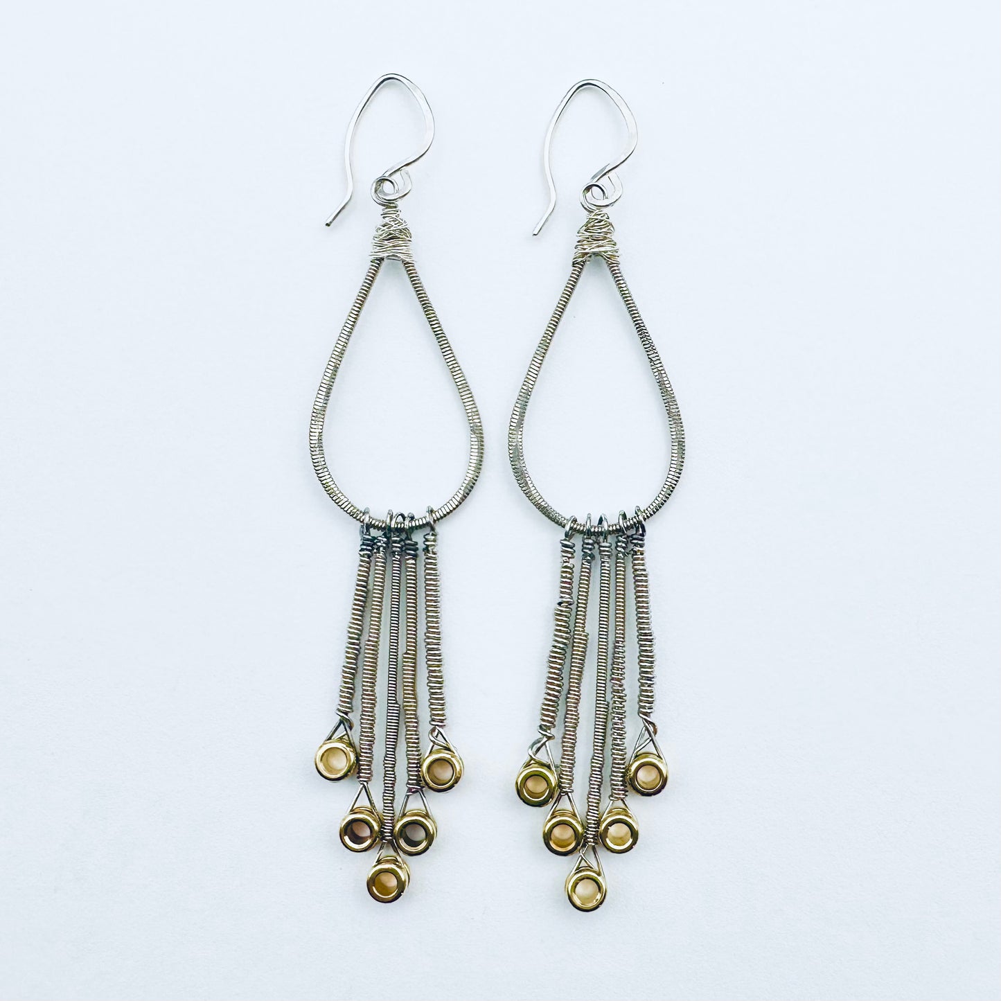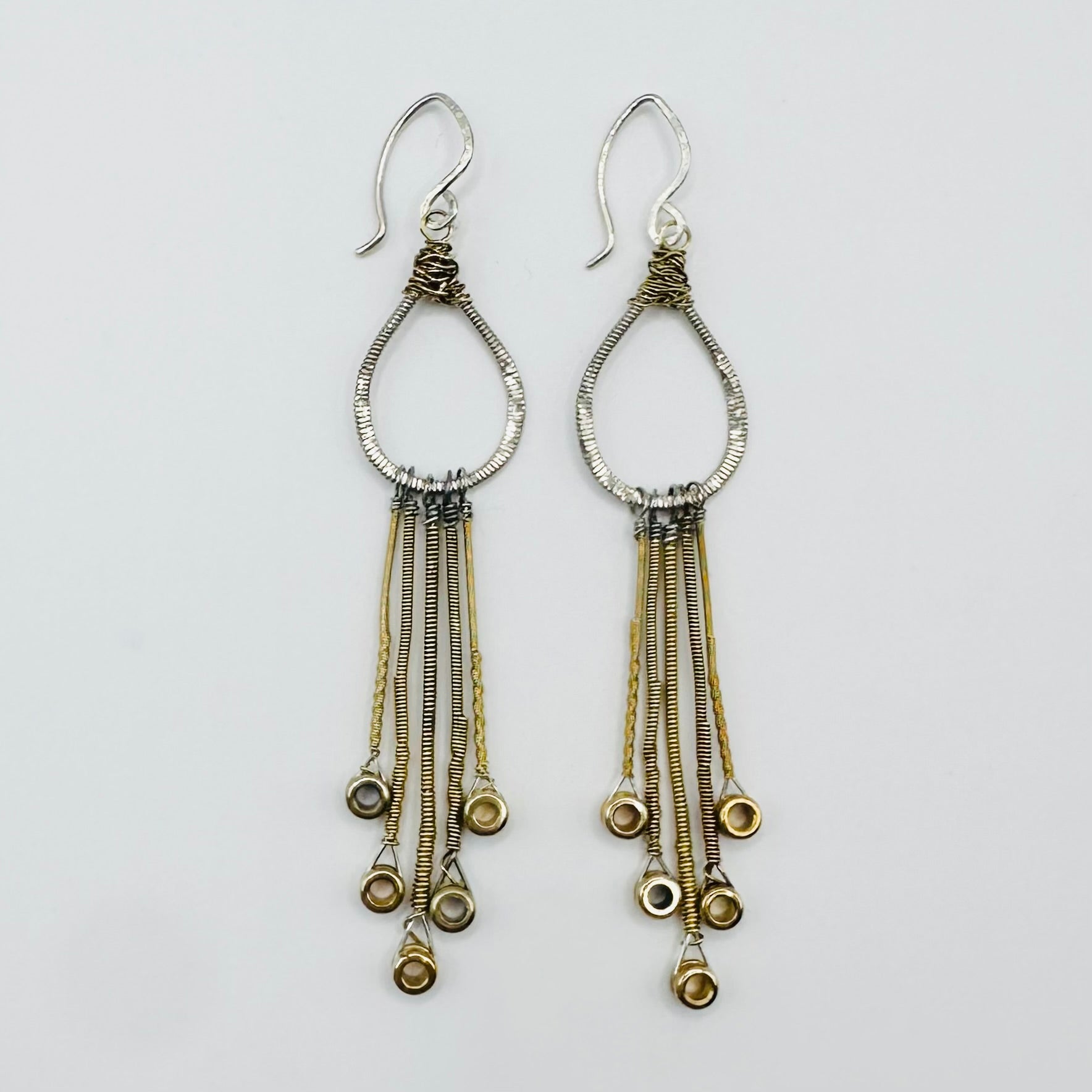Small tear drop with various dangling string ends on sterling silver hand-formed ear wires